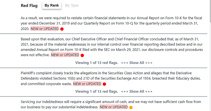 Here are some highlights of what you would have found on the Hudson Labs portal for FuboTV back in May 2021. The company’s top red flags included accounting restatements, ineffective internal controls, and legal issues: