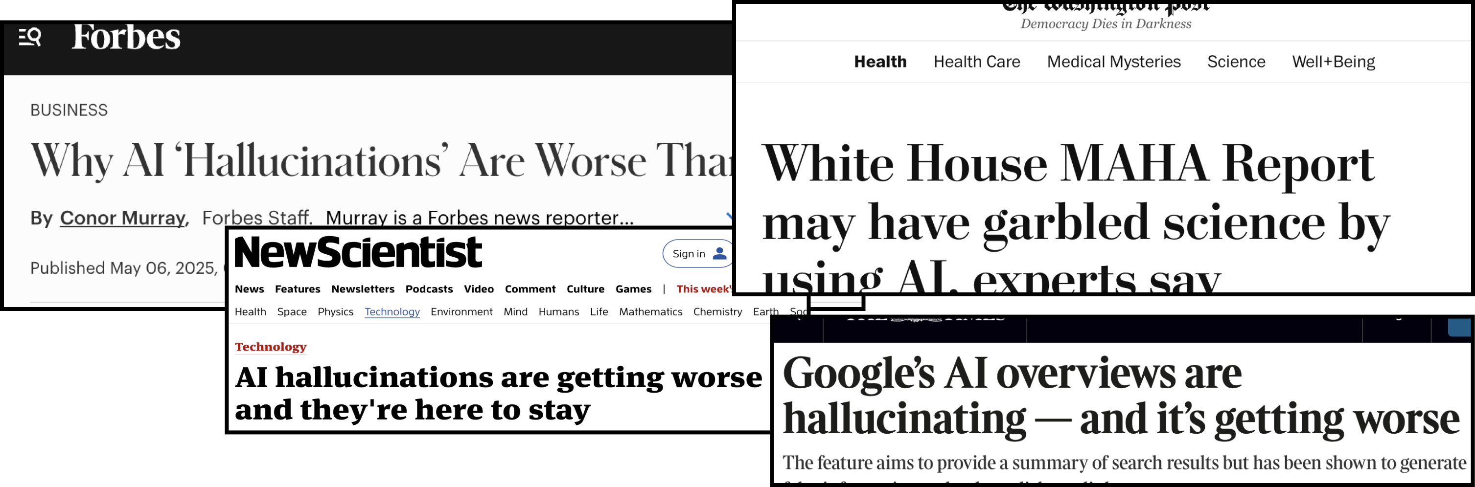 Hallucinations persist and, in some cases, grow worse. As models become more fluent, fabricated statements sound more convincing (Maynez et al., 2020; Ji et al., 2023). Errors are harder, not easier, to detect.