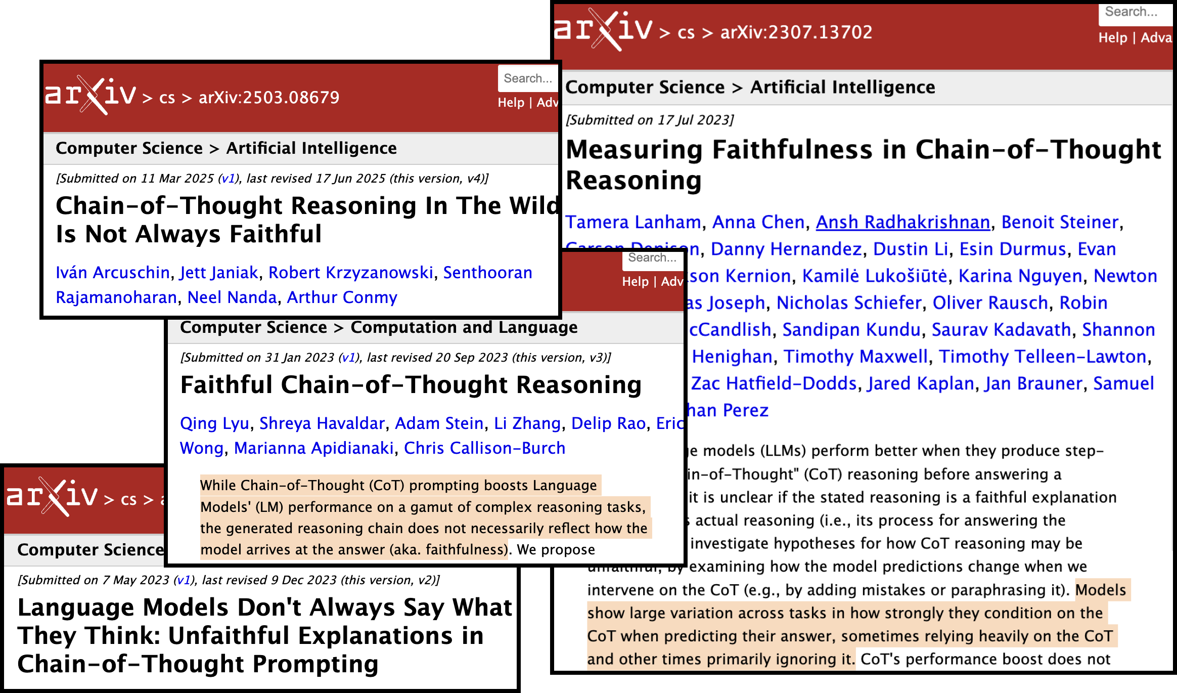 **Lanham, J., et al. (2023). Measuring Faithfulness in Chain-of-Thought Reasoning. → Finds that reasoning traces often look plausible but are not faithful explanations of internal computation.