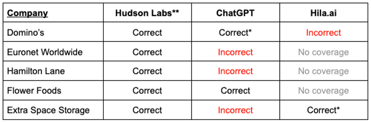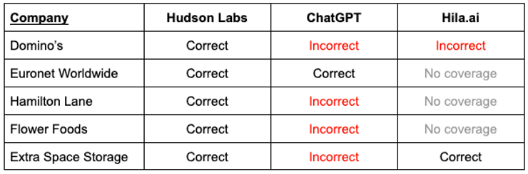 To illustrate the difference between Hudson Labs and other generative AI tools, we tested it against two chatbots—ChatGPT and a finance-specific bot, Hila.ai — on a randomly selected group of U.S. public companies: