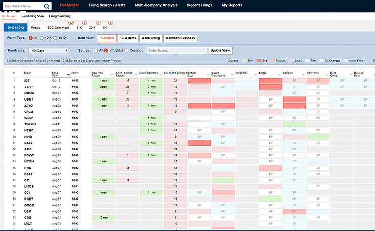 - Short idea generation via screening: We help you find the worst companies trading today using our proprietary risk scoring and red flag categories.
