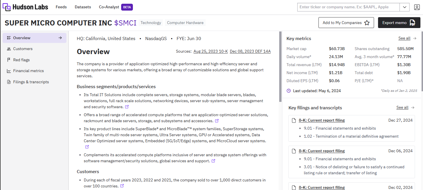 - Machine learned Risk Scores: Hudson Labs' proprietary Risk Scores take advantage of ten years of historical training data including SEC enforcement actions, settled class action lawsuits related to fraud, as well as a terabyte of financial language data.