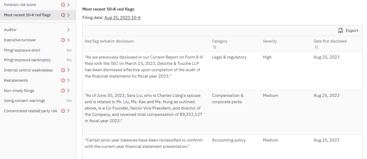 - Qualitative red flags that are predictive of downside risk: Our red flags are extracted based on learned associations with downside events e.g. SEC enforcement. This is in contrast to displaying all items that havechanged year-over-year, many of which are not decision-relevant.