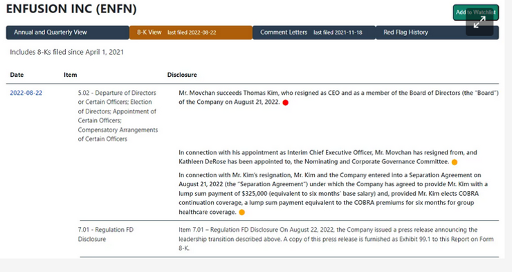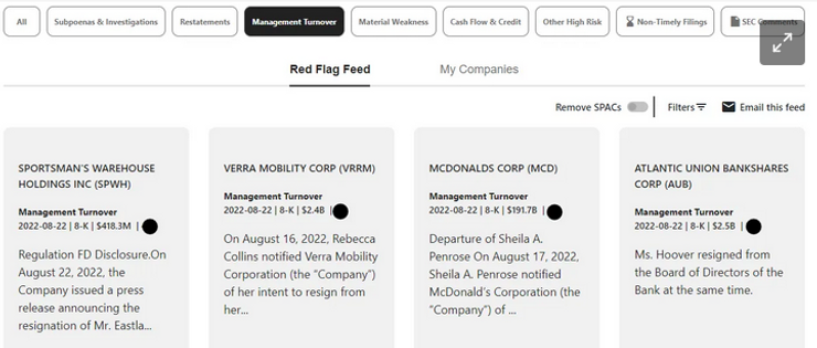 You can also review management turnover updates on specific companies when using our forensic due diligence search and using our 8-K view feature: