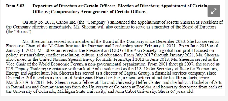 On July 26, 2021, Canoo Inc., an electric vehicle manufacturer, appointed one of its board members, Josette Sheeran, to be the new president of the company. In a Form 8-K, Canoo Inc. discussed the prestigious background of Josette Sheeran: