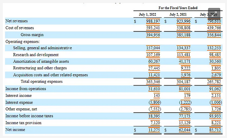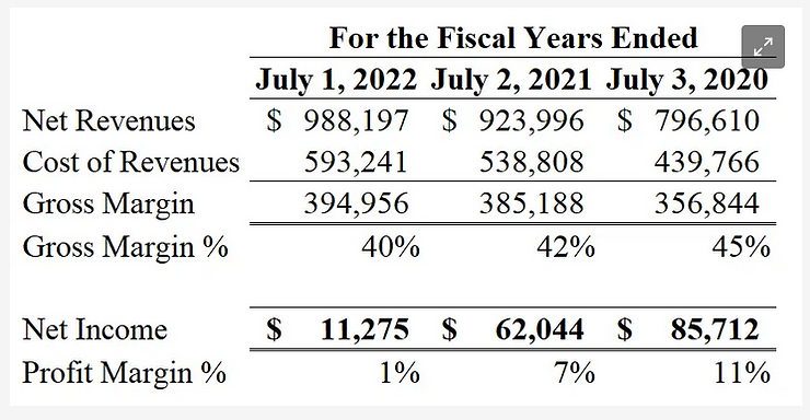 By calculating the gross margin % and profit margin % for the past three fiscal years, you can see that Mercury Systems Inc. has become less and less cost efficient despite their pursuit of revenue growth via acquisitions: