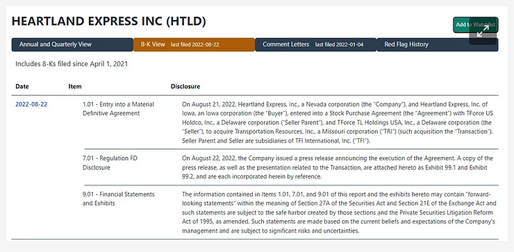 Below is an example of an M&A announcement from the company Heartland Express Inc. (HTLD) through Hudson Labs 8-K view: