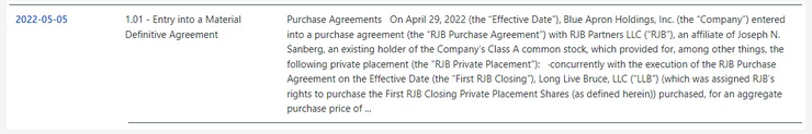 Again, Hudson Labs' 8-K view can be used to see if companies are entering into PIPE transactions. Below is a screenshot of Blue Apron Holdings Inc (APRN) disclosing its private placement agreement. Like M&A transactions, PIPEs are also disclosed as Form 8-K Item 1.01 or 7.01.
