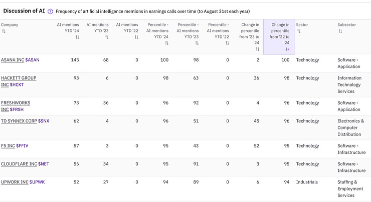 - Asana Inc. $ASAN and Hackett Group Inc. $HCKT went from no AI-related mentions in 2022 to being in the 98th percentile and above for AI-related mentions in 2024.