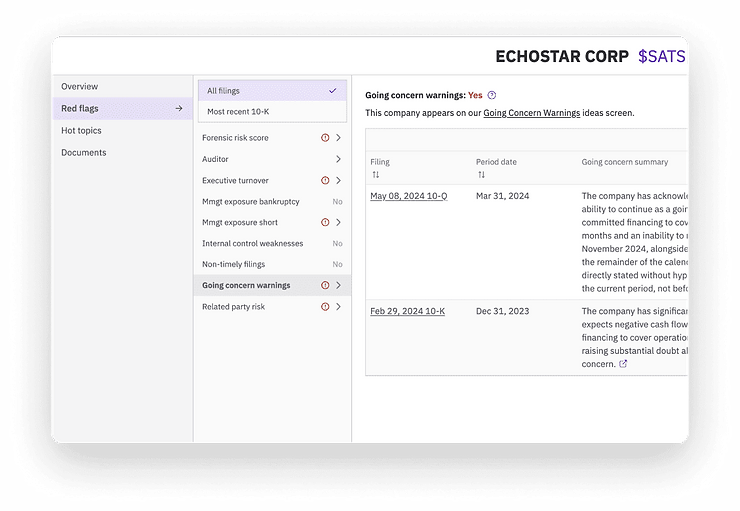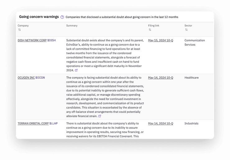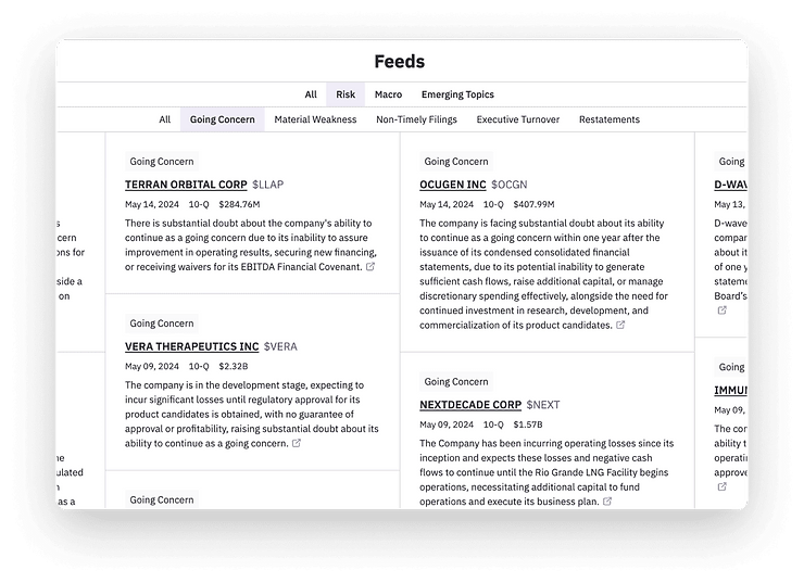 Hudson Labs uses specialized AI models to track, extract and summarize these bankruptcy warnings in real-time. Hudson Labs provides the only complete, real-time dataset of going concern warnings across all U.S. public companies, helping our customers track and react to changes in liquidity risk.
