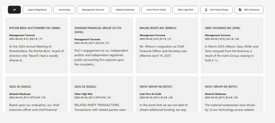 A red flag is defined as an event or an outcome at a company that can be an early indicator of earnings manipulation or fraud, increasing the probability of SEC action. Our premium product, the BFI Risk Score, serves as a measure of the likelihood of fraud or malfeasance.