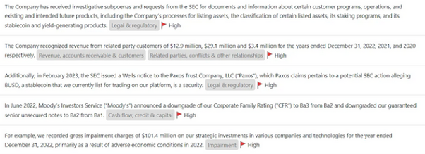 - Our second generation models, launched in 2022, significantly improved our information ranking capabilities (the ability to determine relative severity of red flags) and facilitate ourreal-time AI-generated financial news feed. Our automated news feed is not a news aggregator, it combs through SEC filings and other documents in real-time and extracts price-moving information as it’s published.