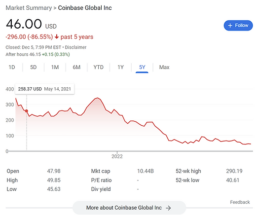 Since then Coinbase’s stock price dropped from over $250 to under $50 per share.