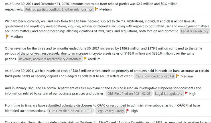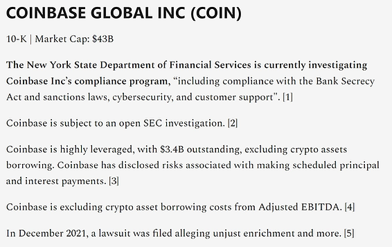 In addition to Coinbase’s high Hudson Labs Risk Score, we flagged multiple red flags at the company to our subscribers from regulatory investigations, related party transactions, crypto accounting questions, high leverage and more.
