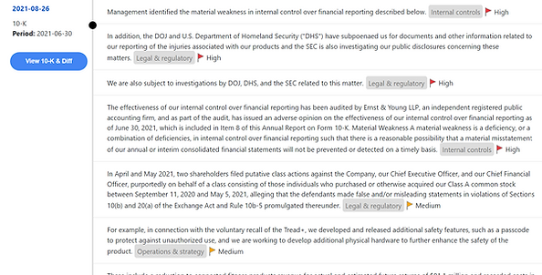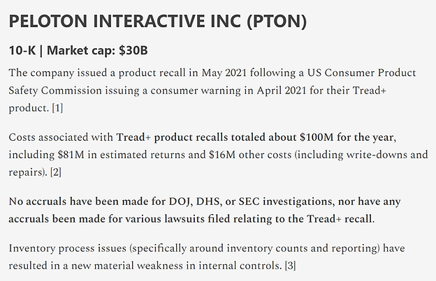 In addition to Peloton’s high Hudson Labs risk score (top 7%), we flagged severe red flags to our subscribers, including ineffective controls over inventory counting in August 2021.