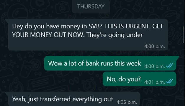 About an hour later, another friend walked over to ask me if I knew what was happening. He had $3M sitting in a bank account in SVB. He started setting up accounts at Mercury and Brex. He attempted to transfer their deposits out but was unsuccessful.