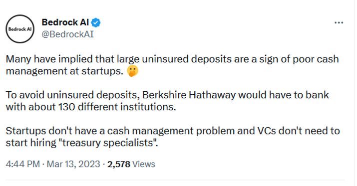 I work out of a WeWork (my favourite de-SPAC with a 70+ Bedrock risk score) in downtown Toronto with a bunch of other founders with millions in uninsured deposits.