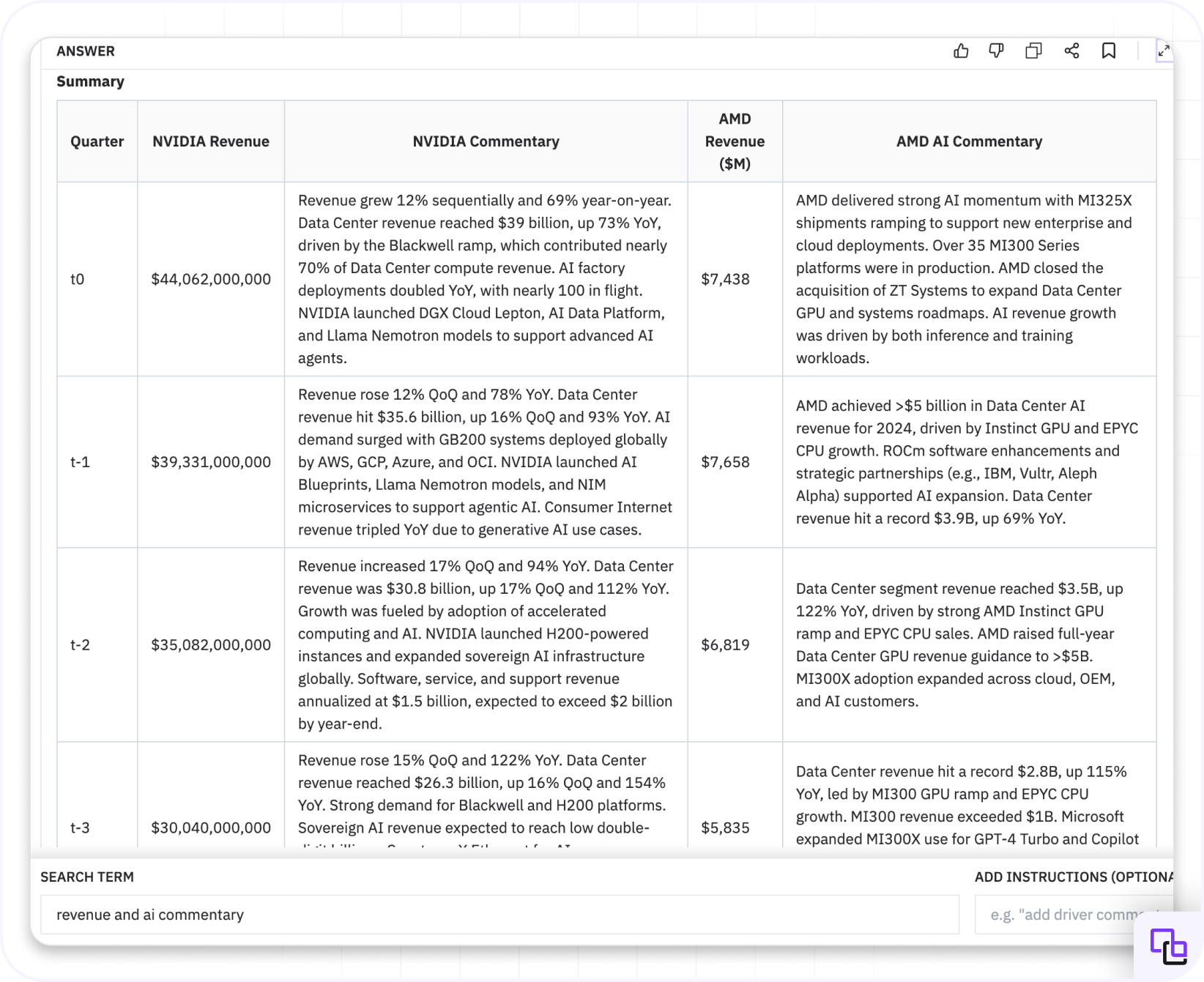 - Consolidate time-series data from multiple documents (e.g., backlog figures across eight earnings call transcripts)