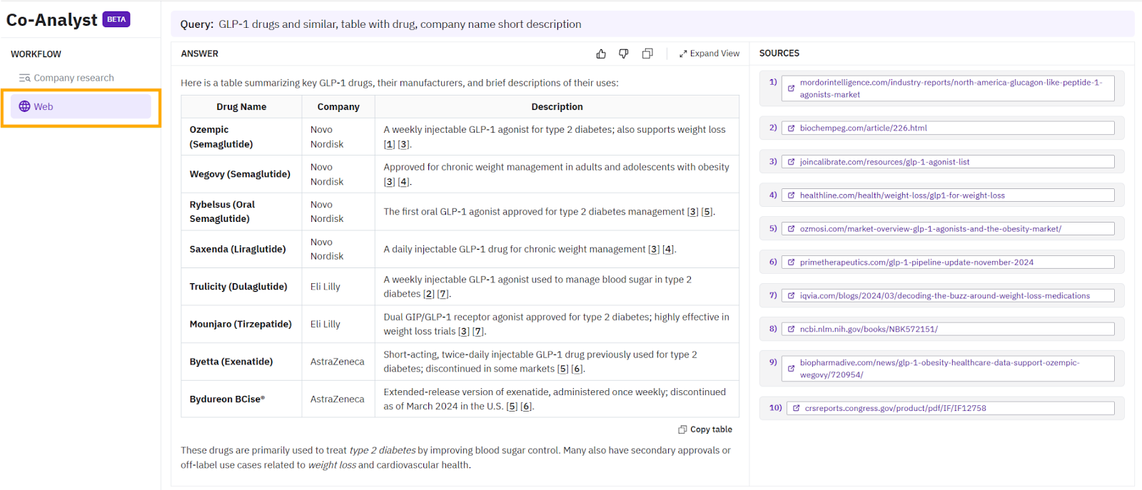 Search term: GLP-1 drugs and similar, table with drug, company name and short description