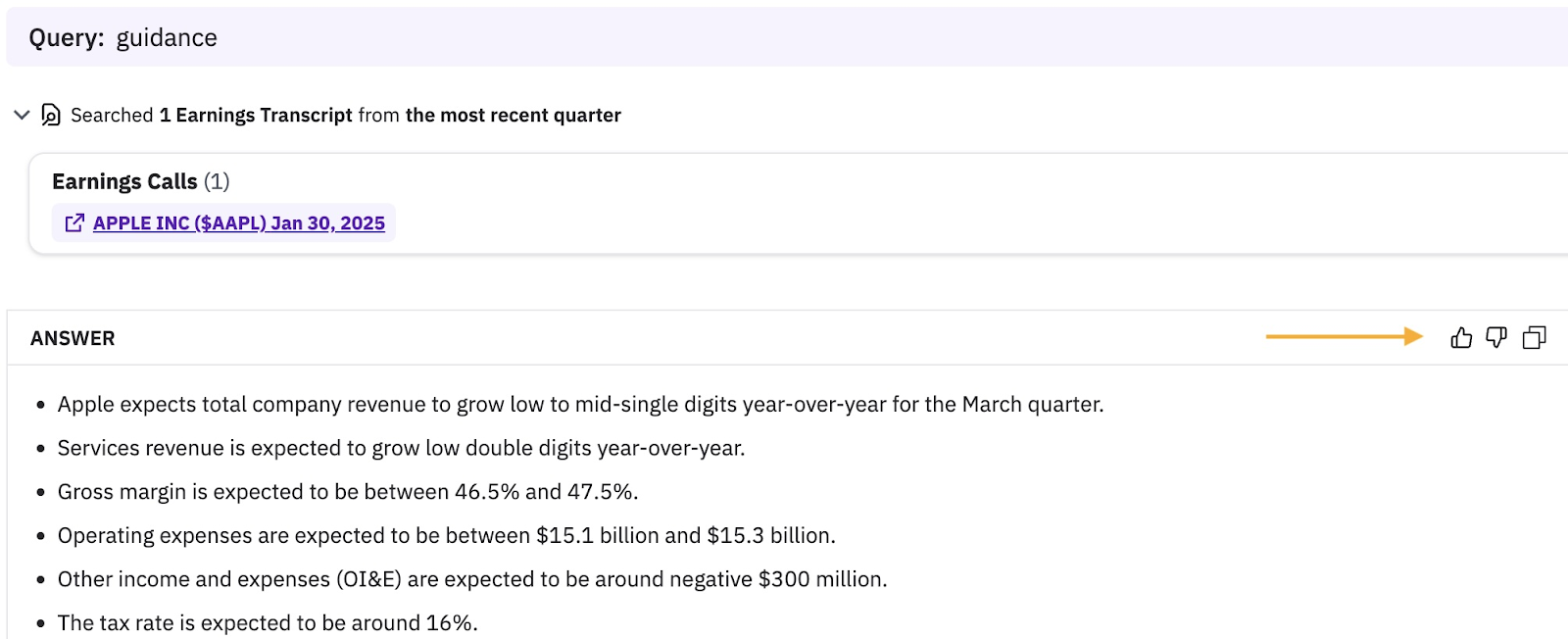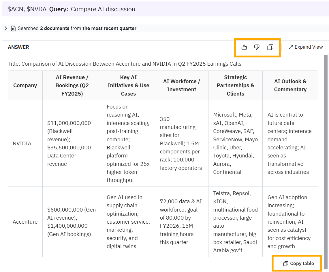 To help us continue improving, you can now easily provide feedback on query outputs. Simply click the thumbs-up or down button to indicate whether the Co-Analyst provided the information you needed.
