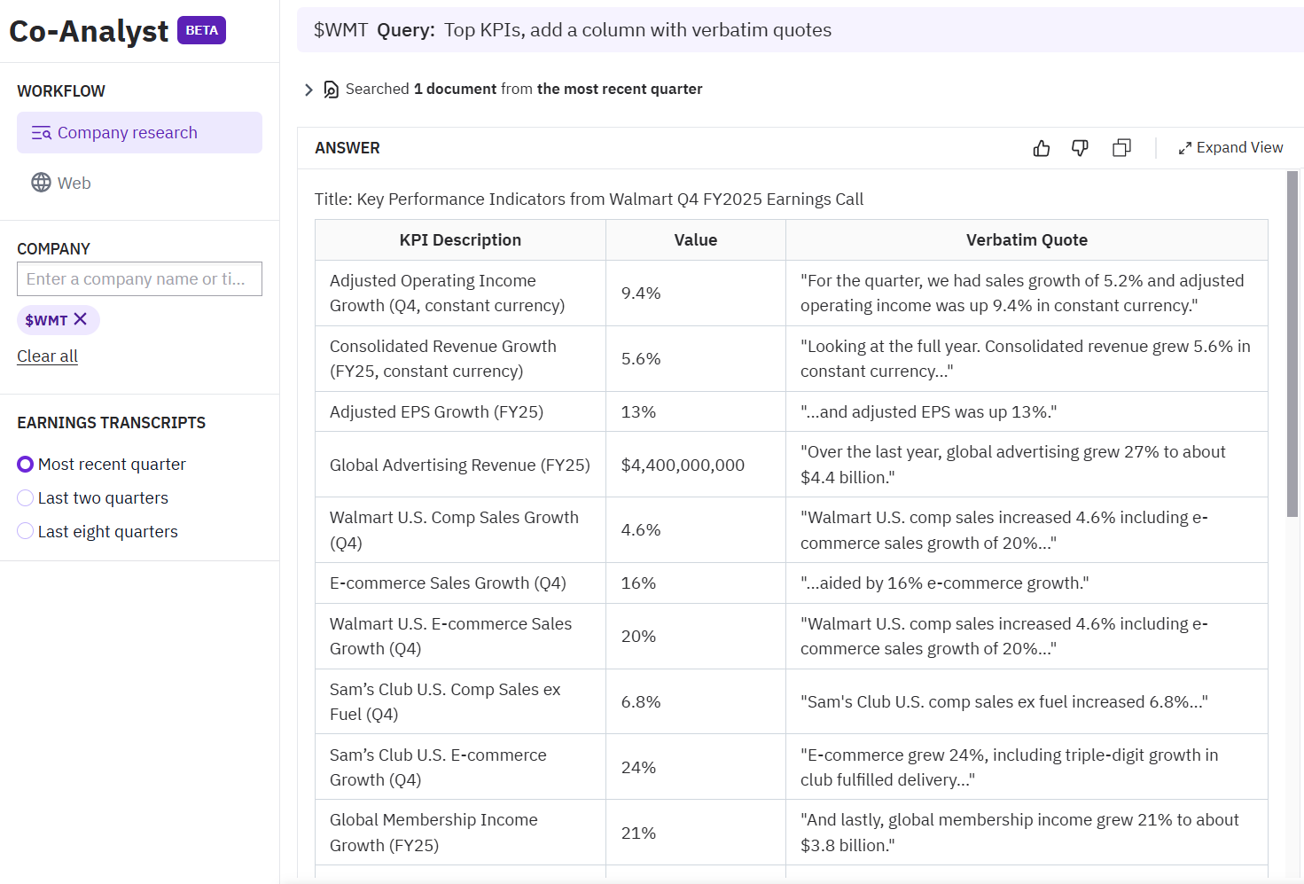 You may see occasional reasoning errors i.e. not understanding whether a figure relates to the full annual period or the quarterly period. This is most often the case when the transcript does not make this distinction clear. However, you will never see fabricated information.