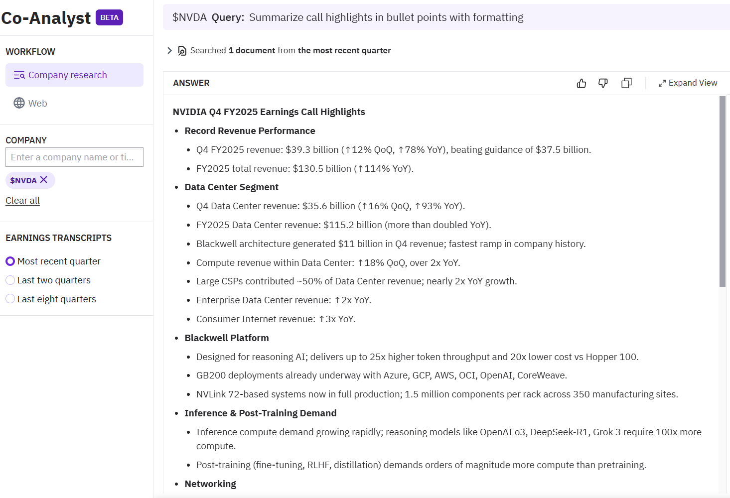 The Co-Analyst continues to get great reviews. Users are increasingly using it for earnings call previews and reviews, with weekly queries doubling since the December launch.