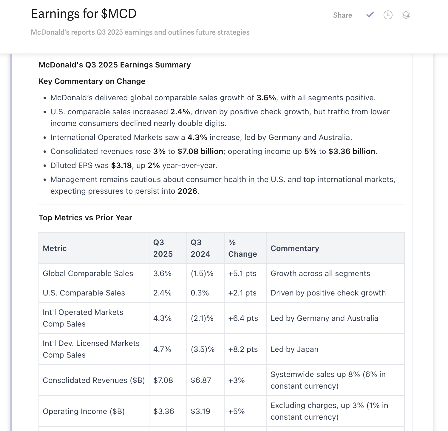 Sample email alert: Earnings summary for McDonald’s Q3’25
