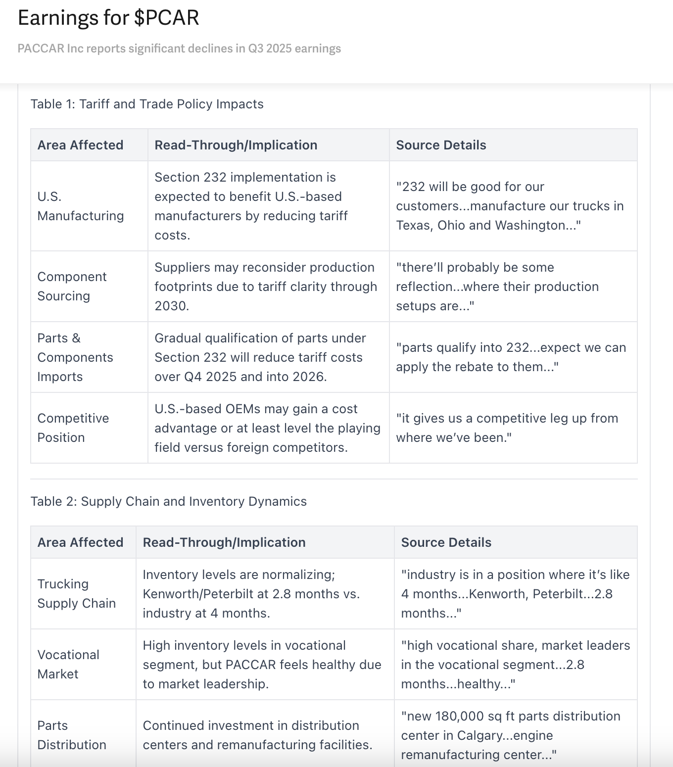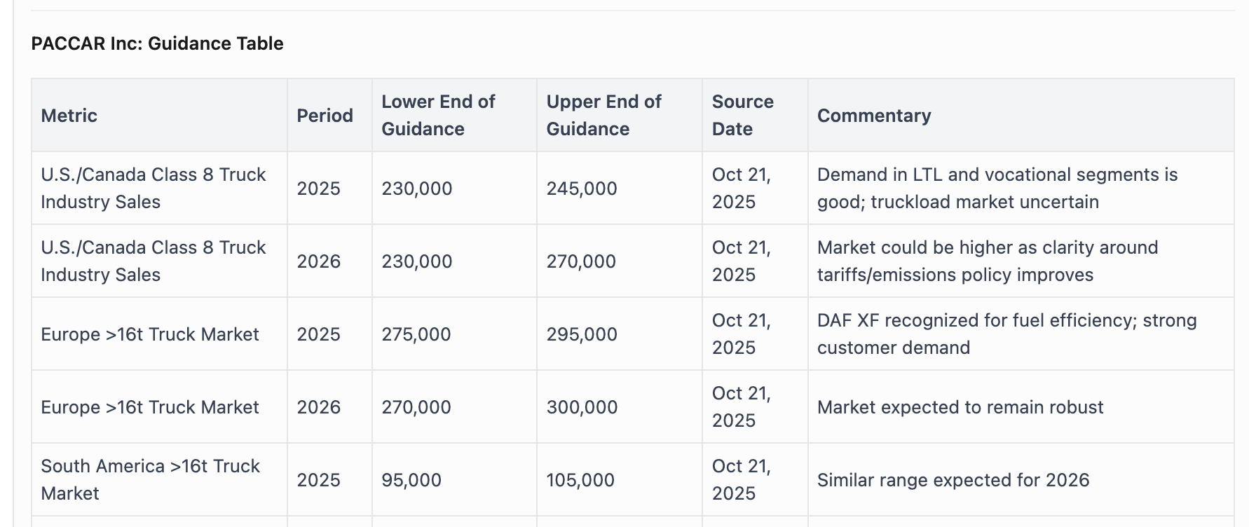 Sample alert: Current guidance from Paccar’s Q3’25 earnings update