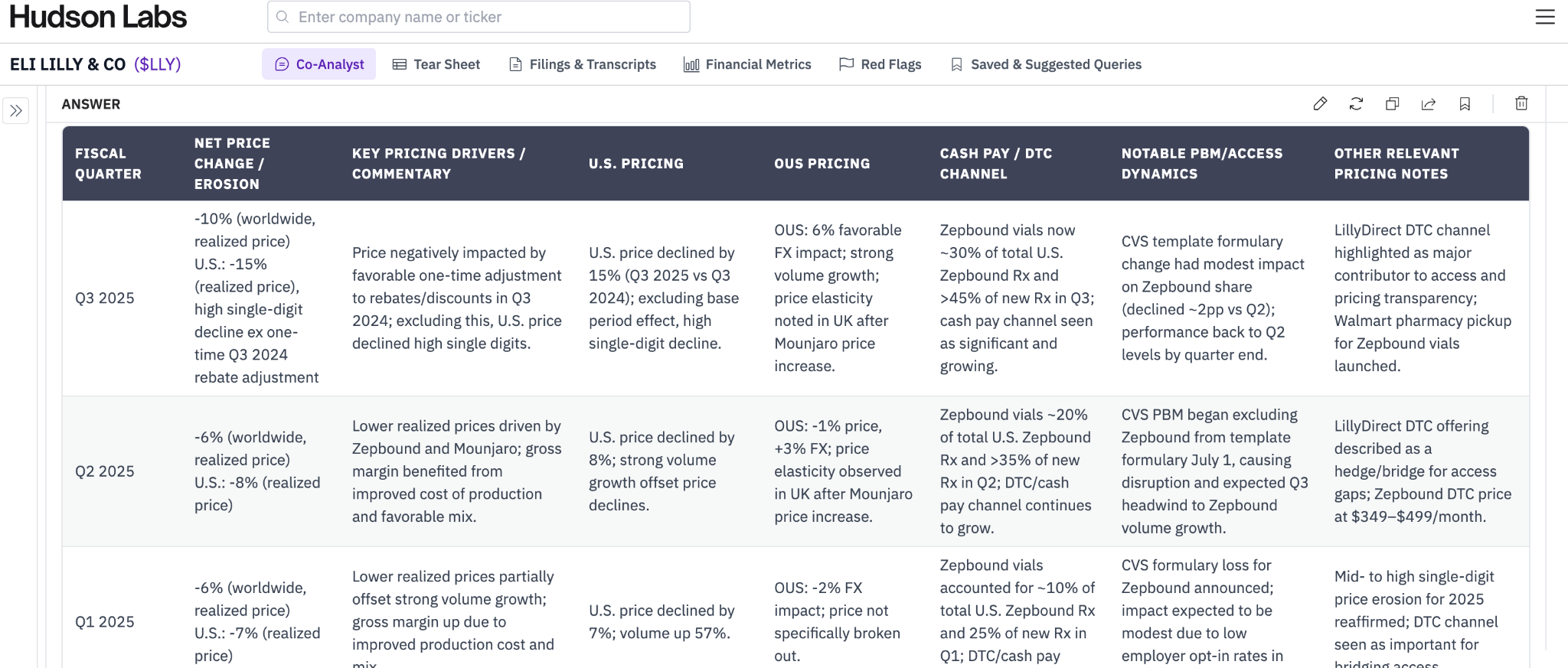 With Hudson Labs’ you can automatically receive earnings summaries in the exact format you need — delivered within hours of the call — for any competitor, peer set, or market segment.