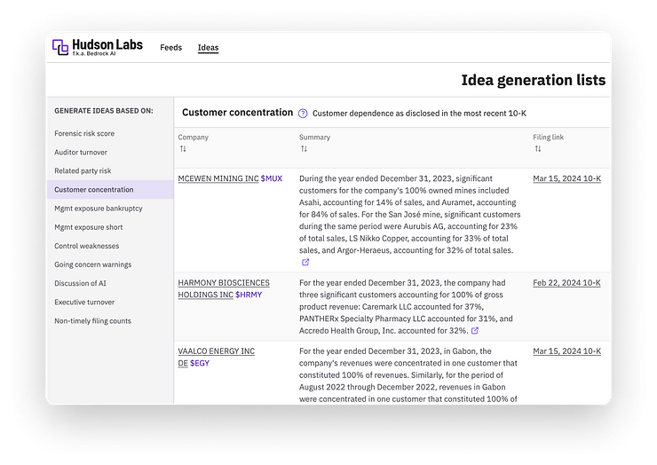 Find the customer concentration screen on the "Ideas" page of the Hudson Labs platform.