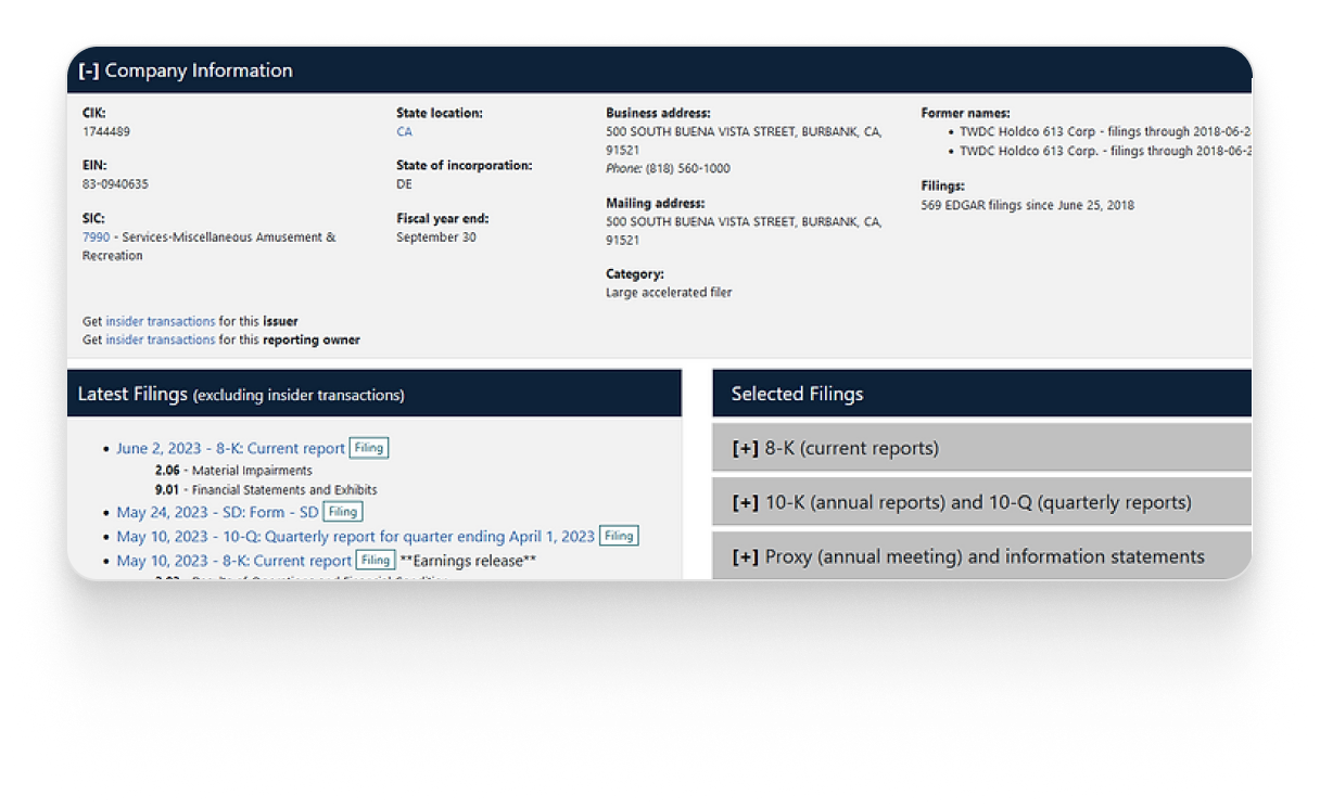 Company-reported financial and transactional data is reported to the SEC through the Electronic Data Gathering, Analysis, and Retrieval system (EDGAR). You can find full financials, XBRL metadata, insider transaction information, prospectuses and more. EDGAR also provides full-text search. EDGAR is free but not trivial to scrape. Refer to the Financial APIs section for programmatic resources. EDGAR is a government-hosted resource that is provided for free.