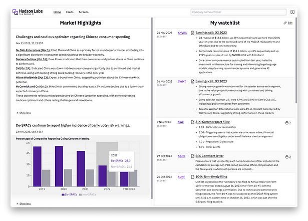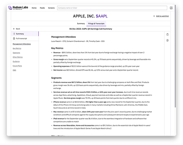 Hudson Labs provides summaries & memos that are factual & auditable and that every equity analyst will be able to use. Hudson Labs supports idea generation by capturing qualitative themes that cannot be captured in a Bloomberg screen. Our tools save dozens of hours for every company covered, enabling broader coverage of adjacent sectors and companies.