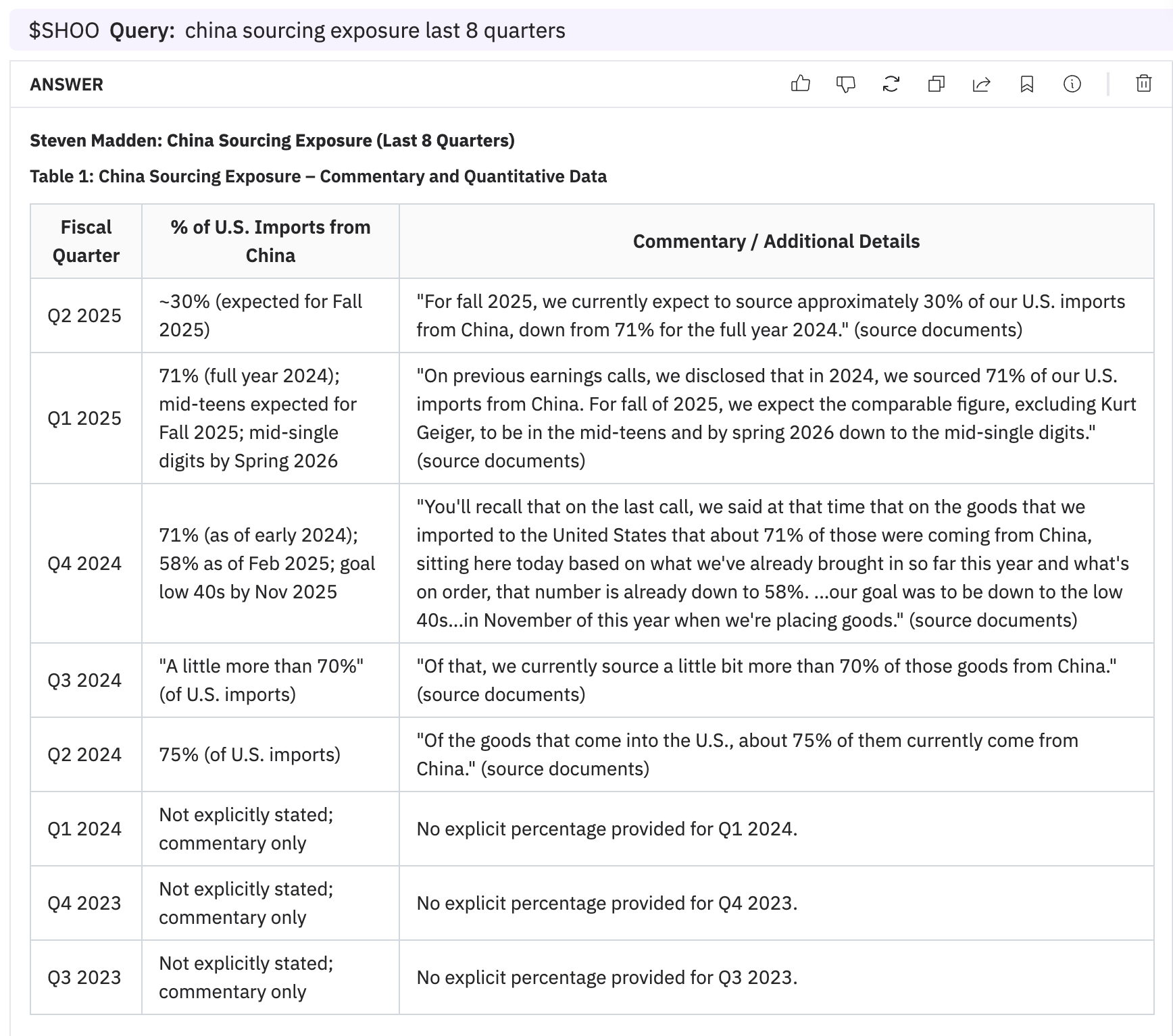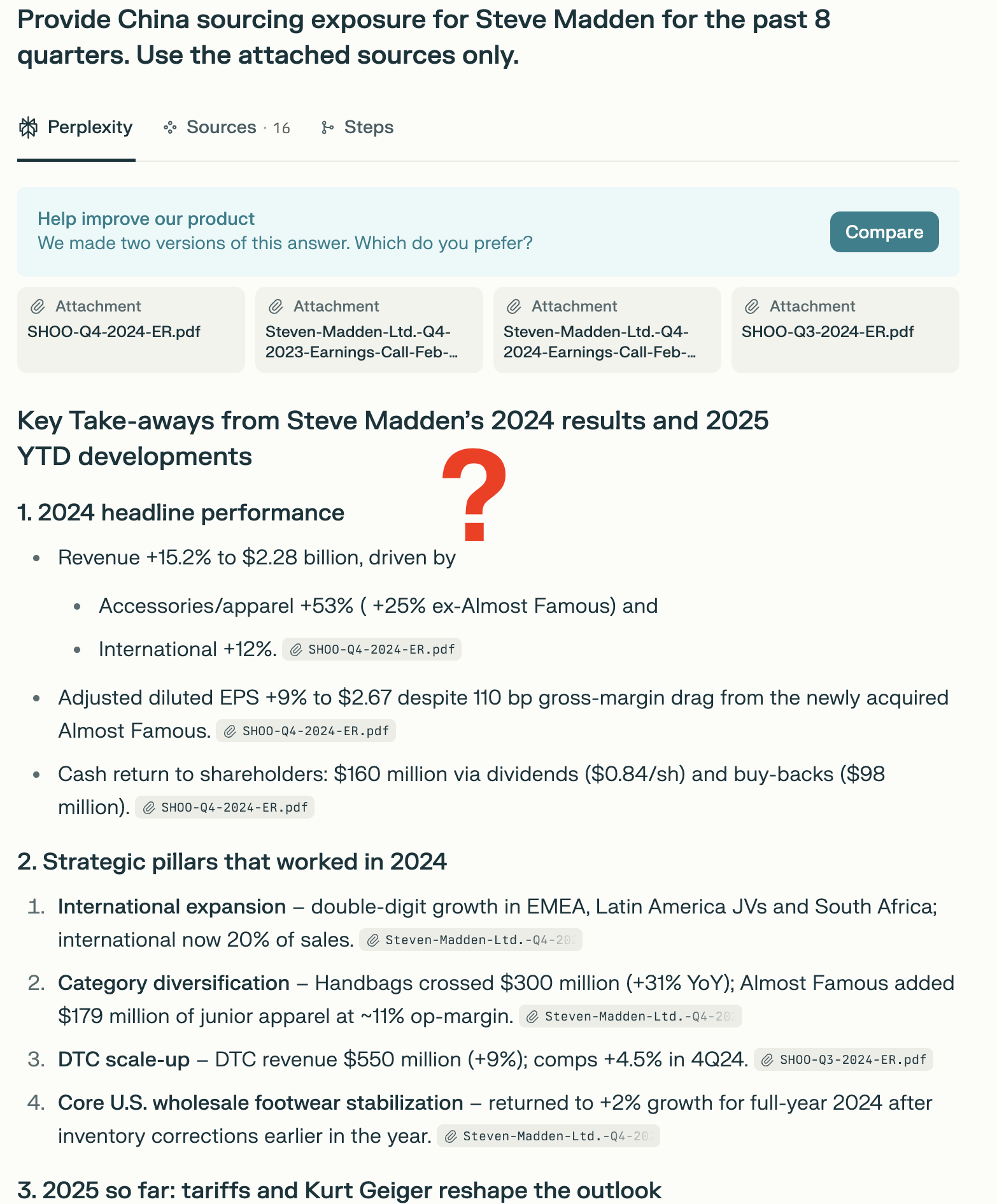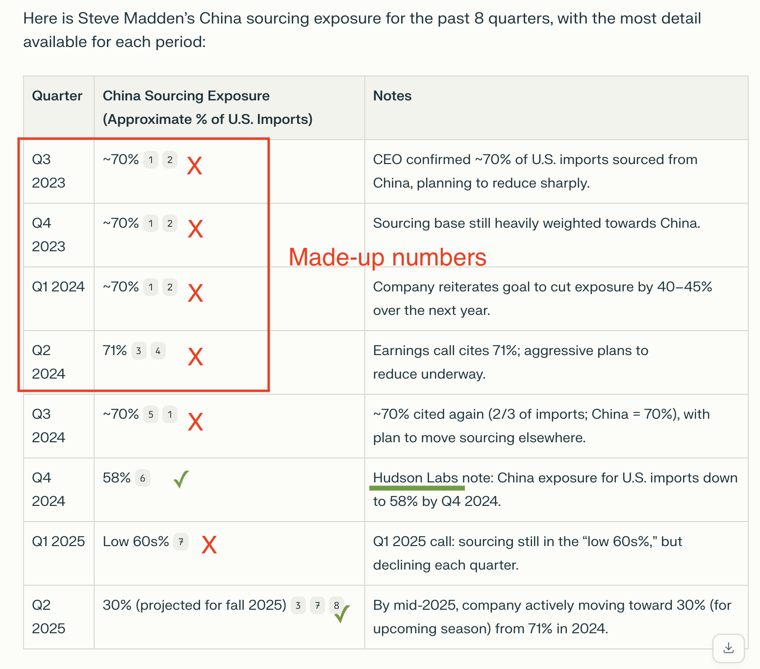 Perplexity Pro correctly identified figures for only 2 of 8 quarters and hallucinated the rest. The China exposure figures for the first three quarters in the table are from an article about Steve Madden’s Q3 2024 earnings call (citation 1 in the image above). Perplexity Pro got the correct figure for Q4 2024, citing one of our blog posts. We tried this query several times. Results varied slightly depending on which sources were selected, but all web-based responses included fabricated figures for multiple quarters. See the full output here.