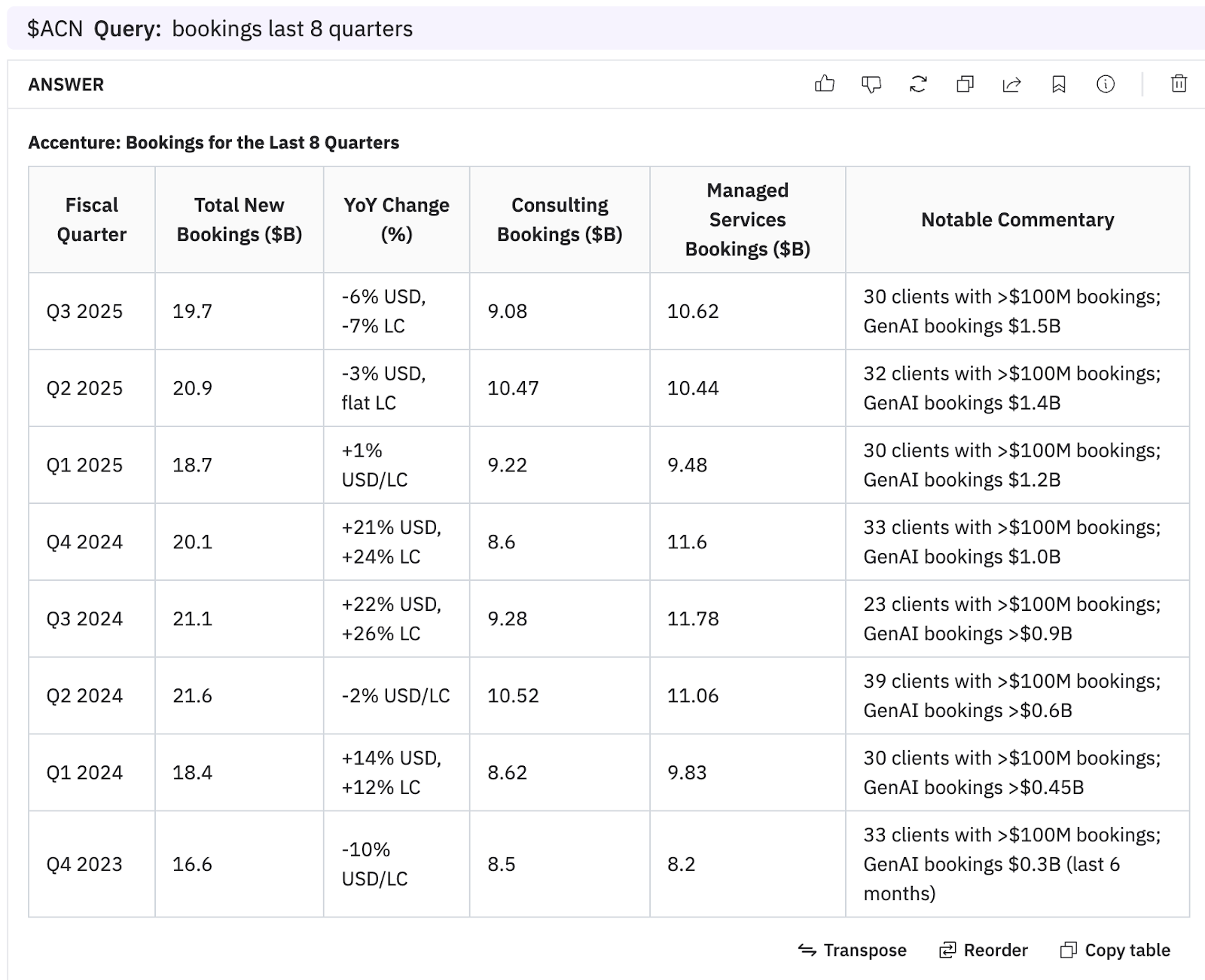 Did not return data for the most recent quarter (Q3-2025) and only covered 4 quarters in total. On the second attempt, when asked for a breakdown by type of work, returned correct data for 7 of 8 quarters. See full results here.