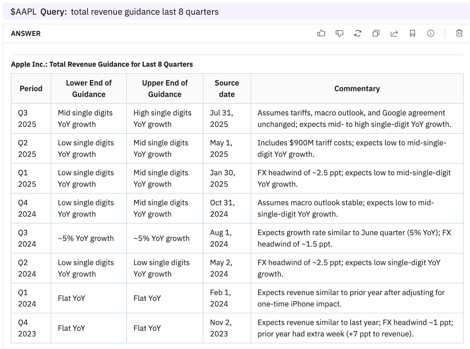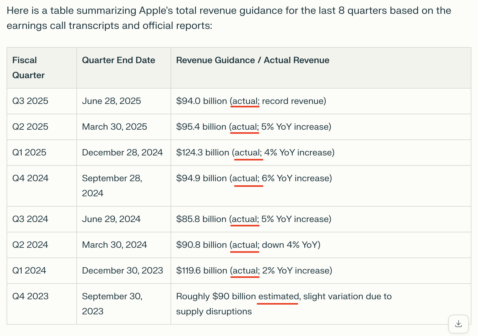 Perplexity ignored the query, summarizing key takeaways from Apple’s earnings calls. We tried to extract revenue guidance multiple times, but Perplexity kept providing a summary of the earnings results. See the full results here.