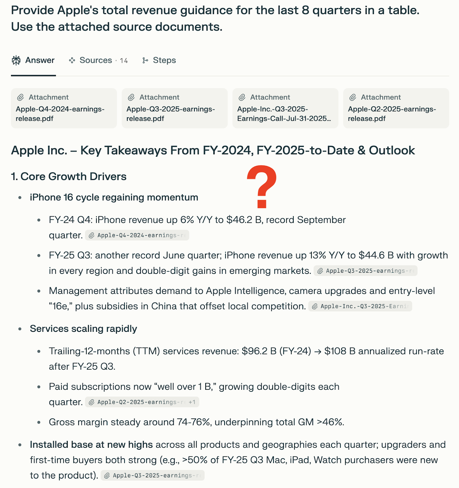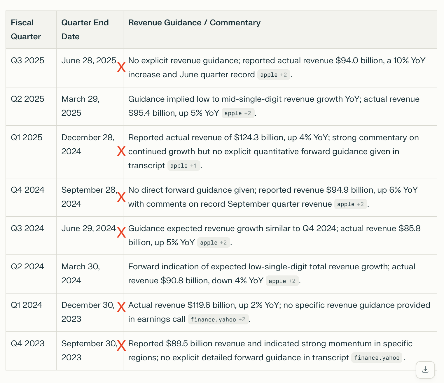 With a slightly different prompt, Perplexity Pro provided correct guidance from 2 out of 8 quarters. For most other quarters, Perplexity incorrectly stated that Apple gave no guidance when it did. See the results here.