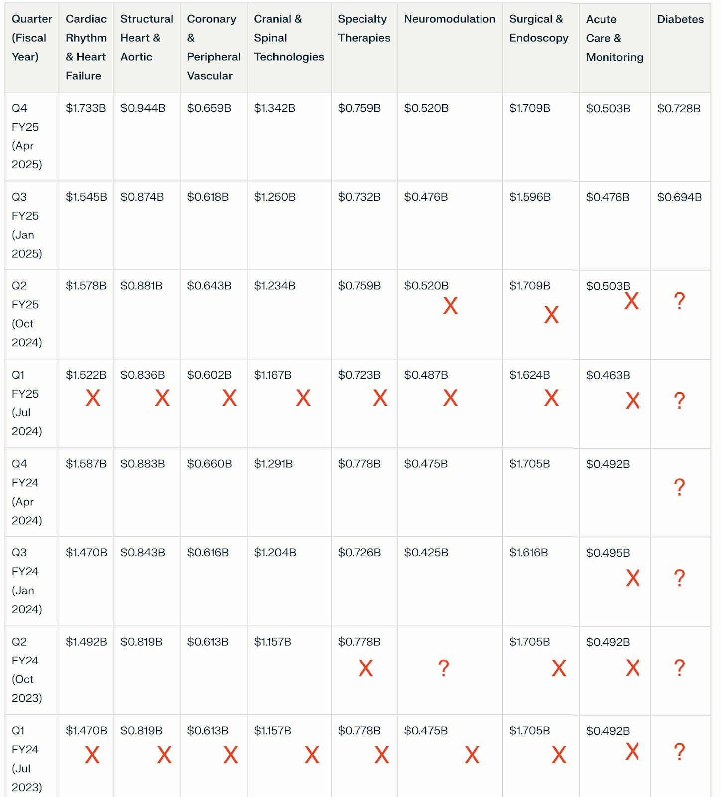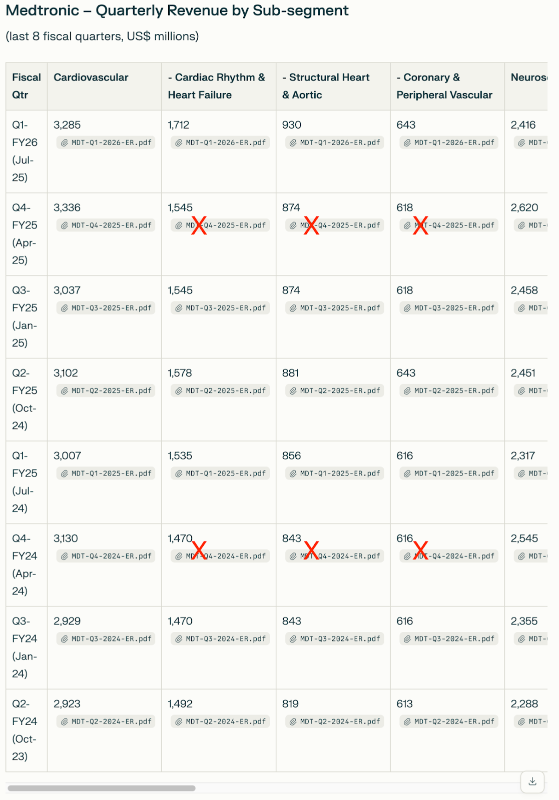Perplexity Pro provided a complete and correct revenue breakdown for 2 out of 8 quarters. It often omitted the Diabetes subsegment and duplicated or fabricated numbers in other subsegments. See full output here.