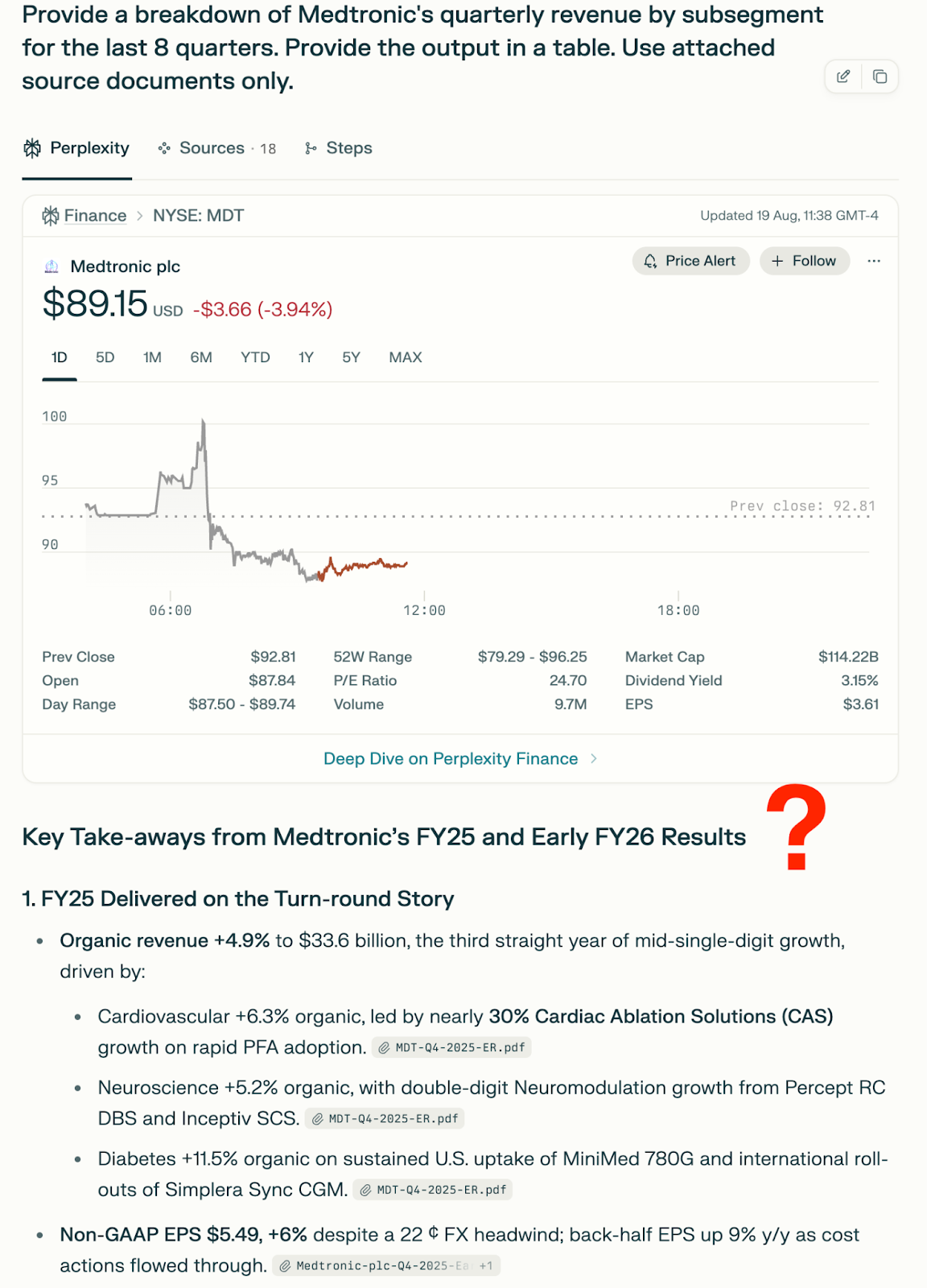 With uploads, our first run ignored the query, summarizing key takeaways from Medtronic’s earnings calls. On the second attempt, Perplexity produced a table with multiple duplicated numbers. See full results here.