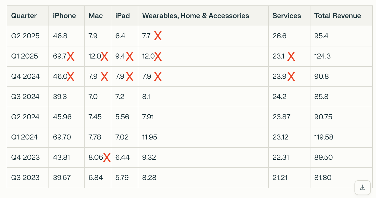 Missed the most recent quarter, Q3 2025 and returned breakdowns by product instead of Apple’s reportable segments. (Apple reports revenue for its segments under the heading "Net sales by reportable segment" in the earnings release.) Several figures were approximate (“~”) and/or incorrect.