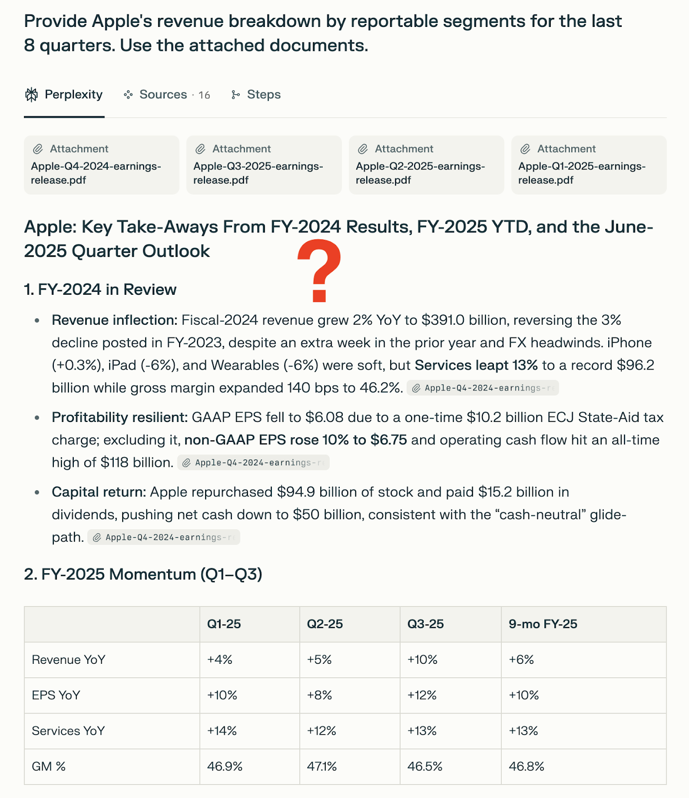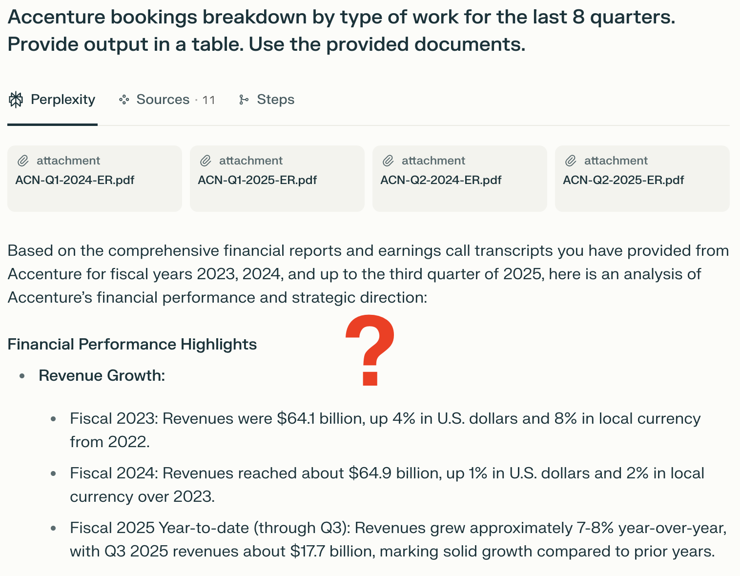 Perplexity Pro’s web-driven architecture allows for broad topical coverage but struggles when data spans multiple reporting periods or requires interpreting nuanced context. In investor workflows, these gaps often translate into missing or fabricated figures.
