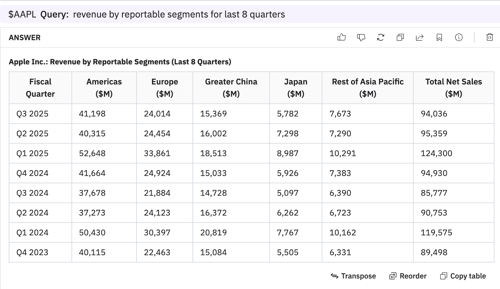A full comparison using FinanceBench queries is coming soon. However, FinanceBench does not test the areas that matter most to our users. It emphasizes mathematical accuracy, whereas the Co-Analyst avoids doing math to ensure traceability to source. FinanceBench lacks robust tests for guidance and multi-period retrieval. Like most benchmarks, it is easy to optimize for and rarely reflects real-world workflows.