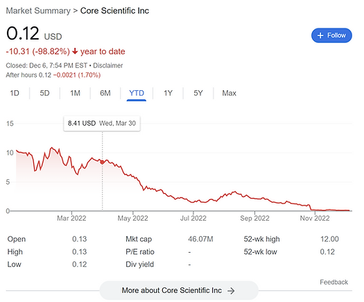 Since then, Core Scientific stock price dropped from over $8 in March 2022 to only 12 cents in December 2022. Not only that, Core Scientific was forced to file for bankruptcy.