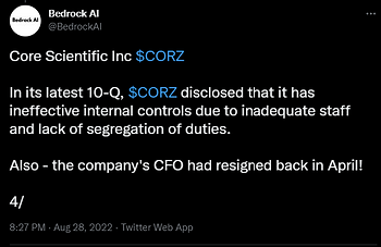 In addition to Core Scientific’s high Hudson Labs Risk Score, we flagged multiple high severity red flags to our subscribers.