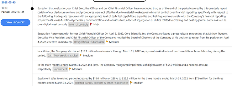 Hudson Labs' algorithms identified qualitative red flags at Core Scientific in early 2022, including: