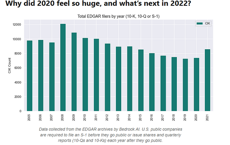 Looking at 2021, it didn’t take a collapse of our financial markets to prompt a slow down in entrants. We could slow further, but for now we’re still outpacing 2015 to 2019 with new EDGAR entrants. The first quarter of the year is typically the busiest time for entrants so when Q1 2022 wraps up we’ll have a better sense of what’s ahead.