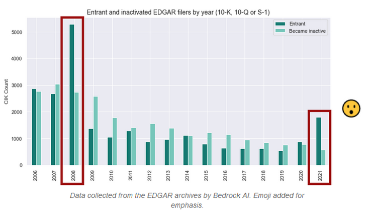 The disconnect between EDGAR entrants and inactivations in 2021 is reminiscent of 2008. Comparisons to 2008 typically aren’t happy.