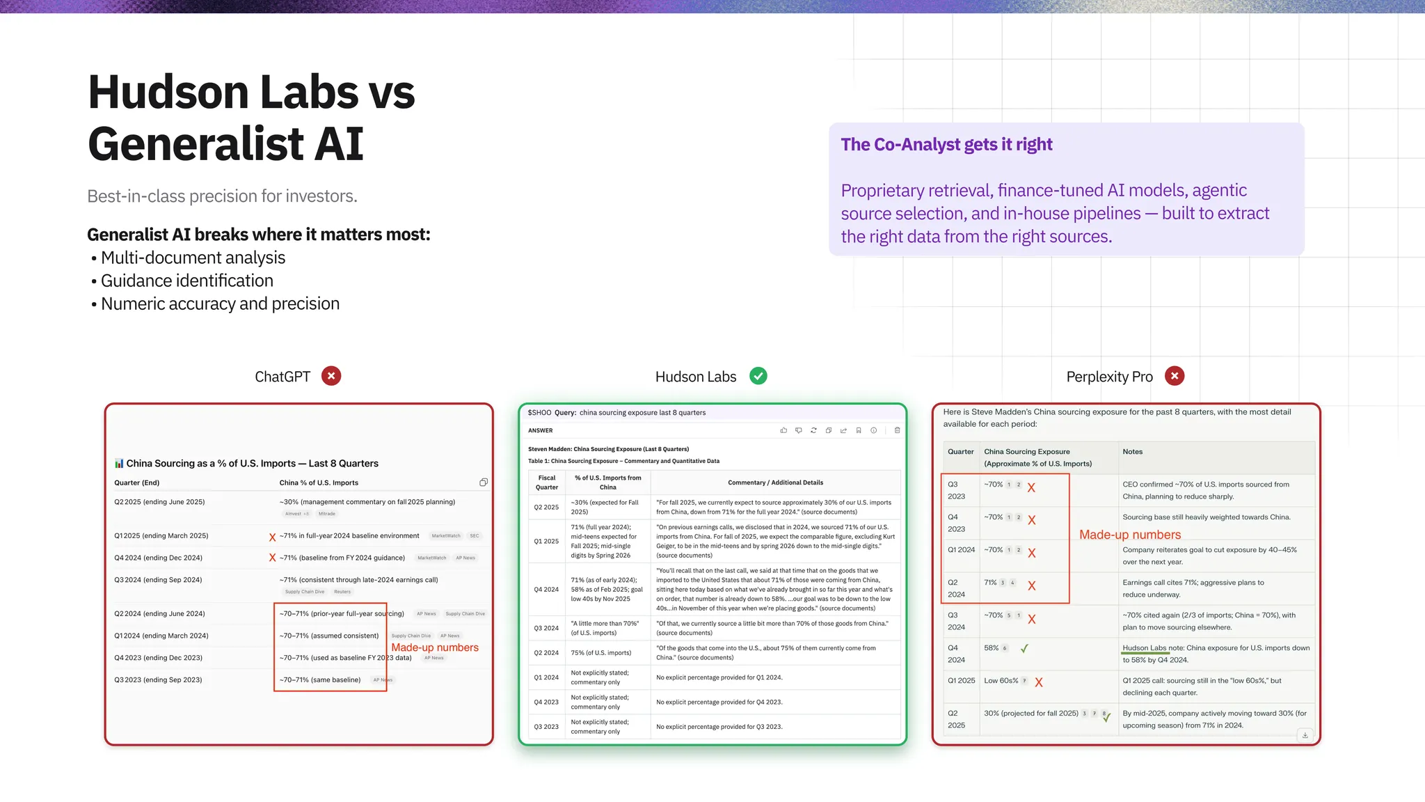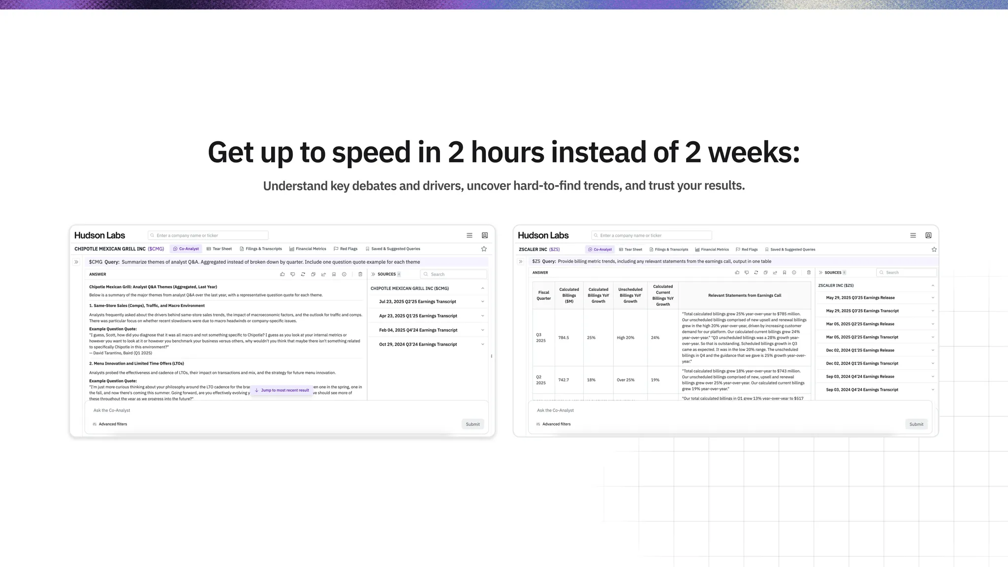 We’re excited to announce the launch of the Hudson Labs Co-Analyst — high-precision AI built for institutional investors. The Co-Analyst delivers what other AI tools can’t: terminal-grade precision with the adaptability of AI