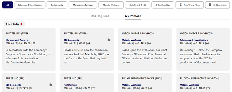 A highly requested and ground breaking new feature just went live. We now offer AI generated financial news feeds, featuring ONLY the highest impact red flags for the companies you care about.