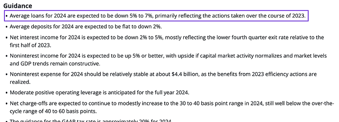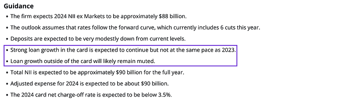 Loan growth is, of course, a core driver of bank earnings. Loan growth guidance is also a good leading indicator for the economy. Looking at Hudson Lab’s summary of JP Morgan’s (JPM) earnings call, the largest US lender is expecting “muted” loan growth beyond credit cards. Other big banks are giving similarly weak guidance. For instance, Bank of America (BAC) is projecting modest** “low to mid-single-digit loan growth”, while Wells Fargo (WFC) is expecting a “slight decline” in average loans for the year. Deloitte is also forecasting overall loan growth in the sector to be “modest, at best.”
