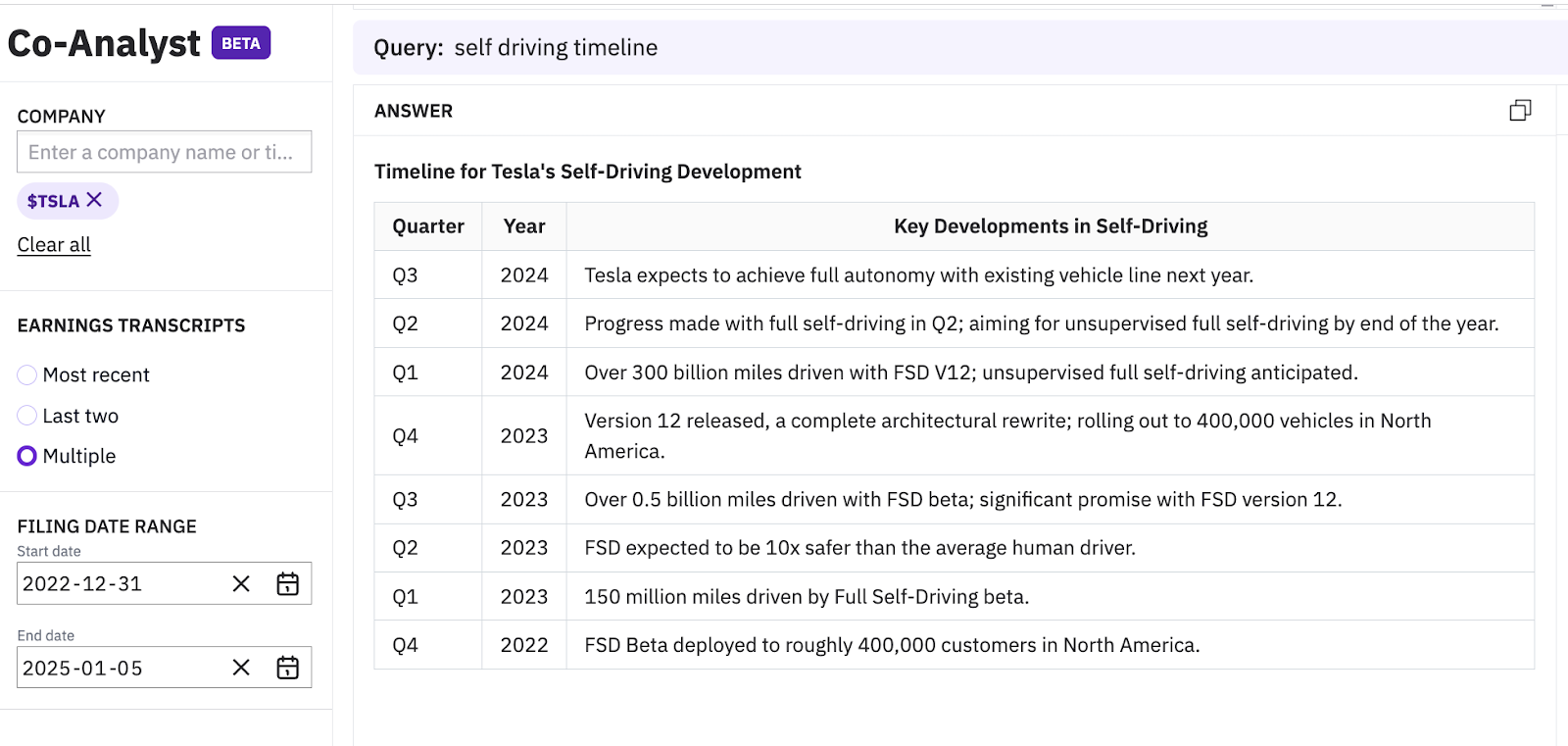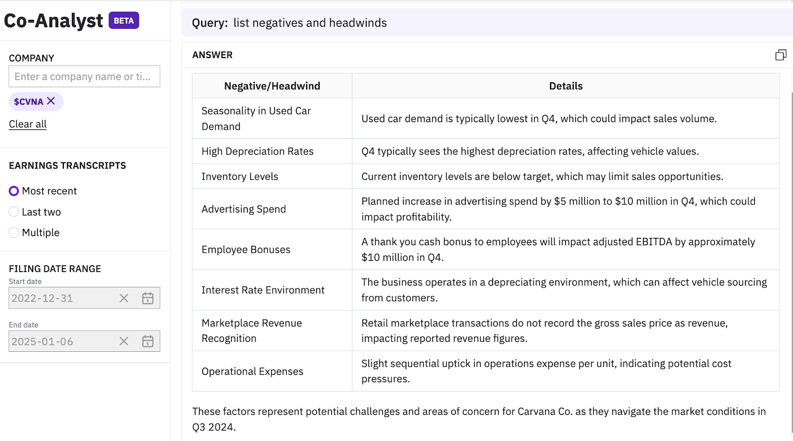 The Co-Analyst is purpose-built for financial content and focuses on specific workflows such as due diligence. Unlike competitor financial chatbots, which are error-prone, the Co-Analyst delivers consistent and reliable output without hallucinating or generating incorrect information.